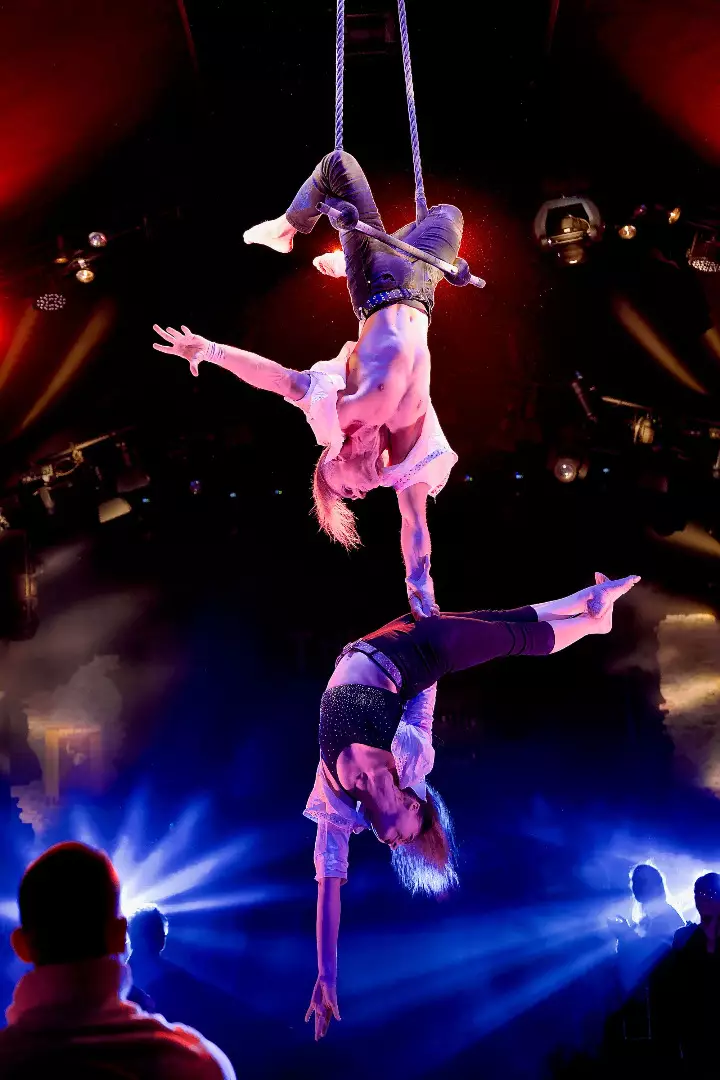 Die leidenschaftliche, romantische Trapezperformance des Duos Oksana und Grygorii aus der Ukraine verbindet einzigartige dynamische Elemente mit Luftakrobatik. Der fließende Fluss hochtechnischer Fähigkeiten und intensiver Leidenschaft schafft ein fließendes Luftballett, das stets starke Emotionen hervorruft. Mit einer komplexen Routine aus Balance, Kraft, Disziplin und Anmut verleihen sie ihrer Präsentation des menschlichen Körpers in all seiner Schönheit und all seinen Möglichkeiten eine besondere Eleganz.