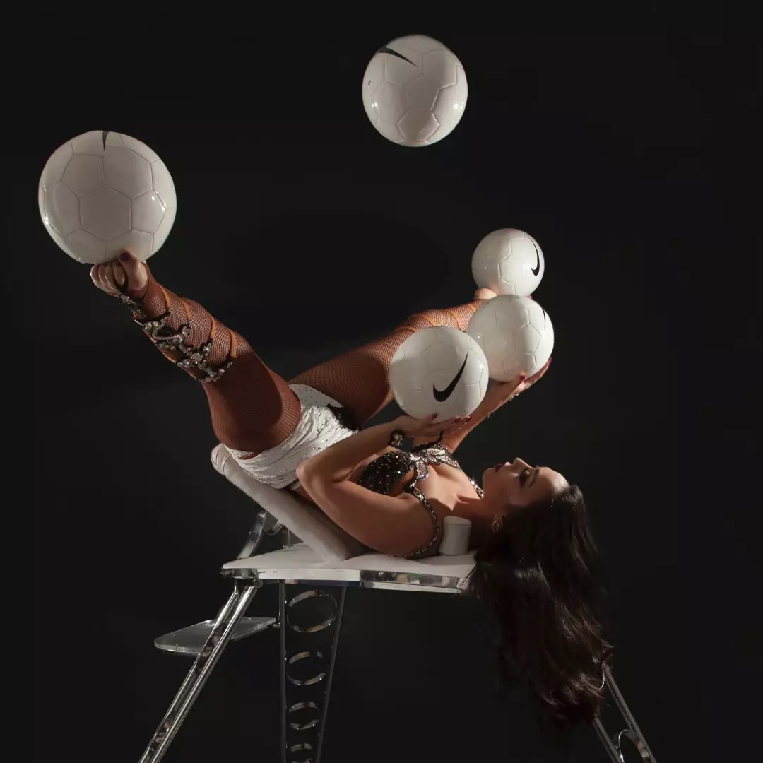 Das Showbusiness wurde Kimberly Lester sprichwörtlich in die Wiege gelegt, denn sie ist die vierte Generation einer traditionsreichen Künstlerfamilie. Aber auch Kimberlys Referenzen können sich sehen lassen. Ihre bezaubernde Performance ist eine wunderschöne Mischung aus anspruchsvollen Jonglagetechniken und einem sinnlichen orientalischen Touch. Ganz nebenbei hält Kimberly Anne Smith da Silva, wie die Künstlerin mit bürgerlichem Namen heißt, gleich zwei Rekorde im gleichnamigen „Guinness Buch der Rekorde" mit ihrer Jonglage-Performance, in der sie auf dem Rücken liegend mit den Füßen bis zu sechs Bälle gleichzeitig in der Luft hält.